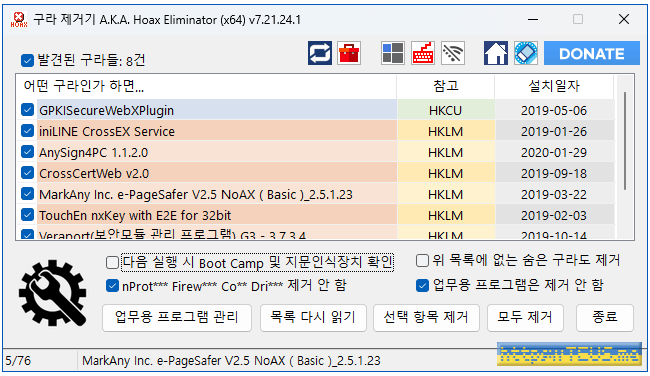 실행하게 되면 나의 컴퓨터에 설치된 프로그램들 중에서 제거해야 할 프로그램 목록을 보여줍니다. 선택해서 삭제할 수도 있지만, 그냥 모두 제거하는 게 좋습니다.